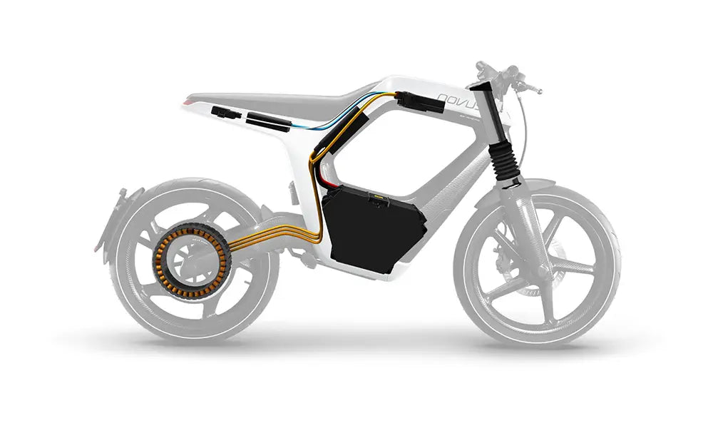Jeder NOVUS wird in Deutschland in Handarbeit aus Carbon in Luft- und Raumfahrtqualität gefertigt. Das Ergebnis ist ein Rahmen, der stark, skulptural und unglaublich leicht ist. Alle wichtigen Komponenten – einschließlich Schwinge und Räder – sind aus Kohlefaser gefertigt, was dem NOVUS sein unübertroffenes Leistungsgewicht verleiht. Es gibt keine Gänge, keine Ketten und keine unnötige Komplexität. Nur sofortige Beschleunigung und intuitive Handhabung.
